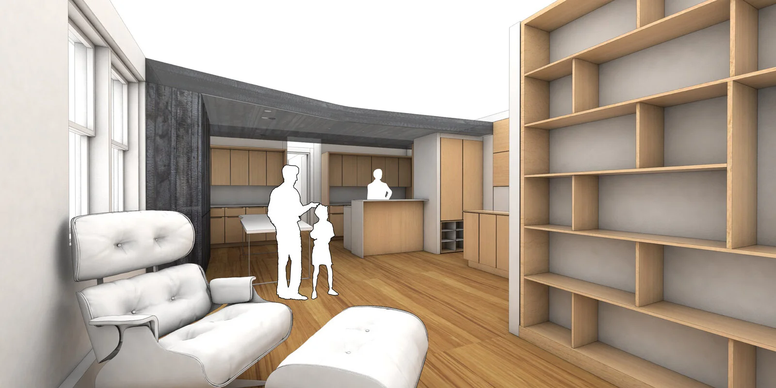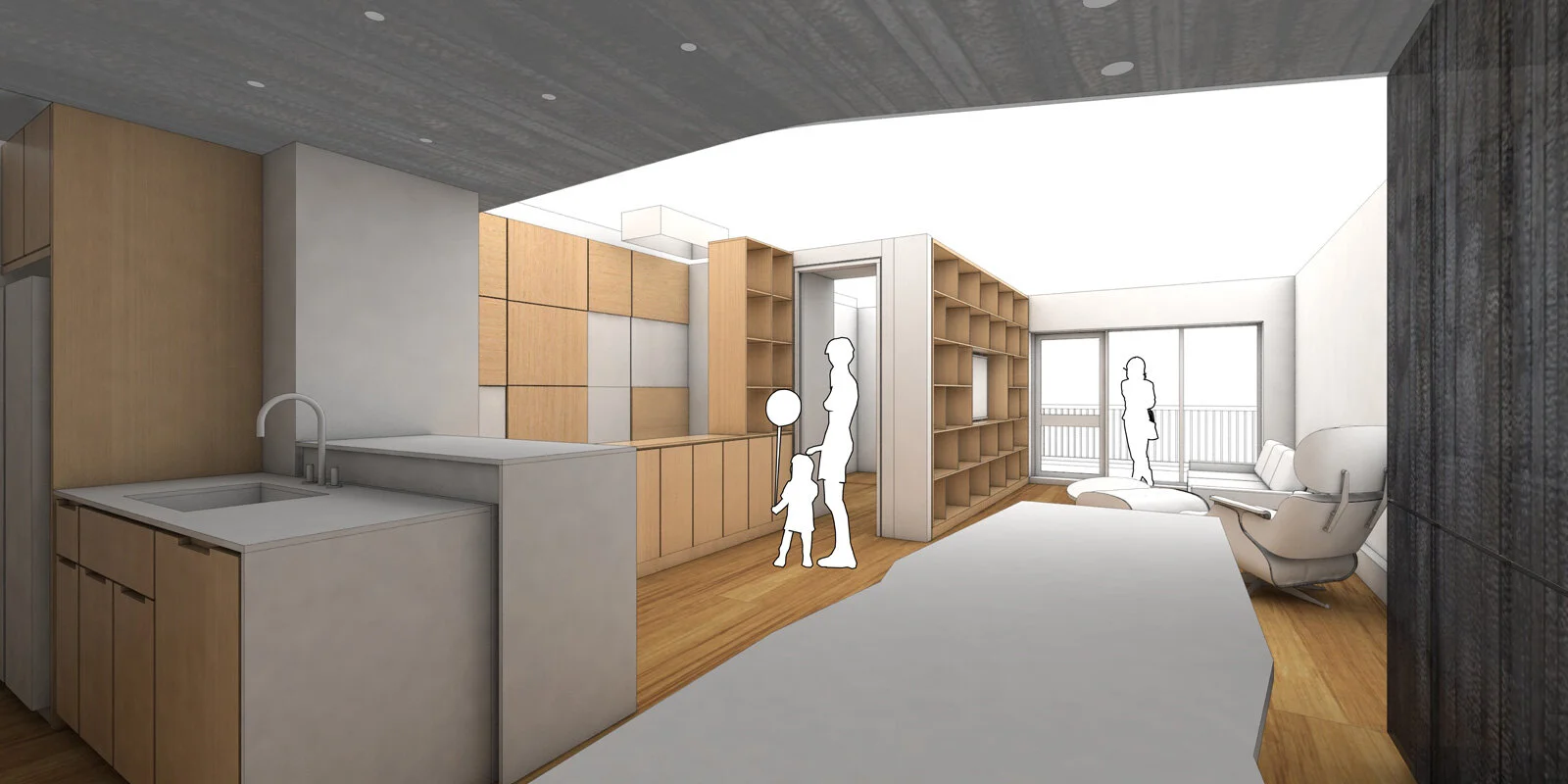 This 1000sf apartment renovation is a complete gut of a second-floor, corner apartment in Bay Ridge, Brooklyn. Facing west, with wonderful afternoon light and a terrace, the architecture becomes a series of design insertions into the space to organize and define cooking, eating, sleeping, and living items. The desire for a modern and contrasting material palate is achieved through the use of simple baltic birch plywood, blackened steel, and charred Cypress millwork paneling.
