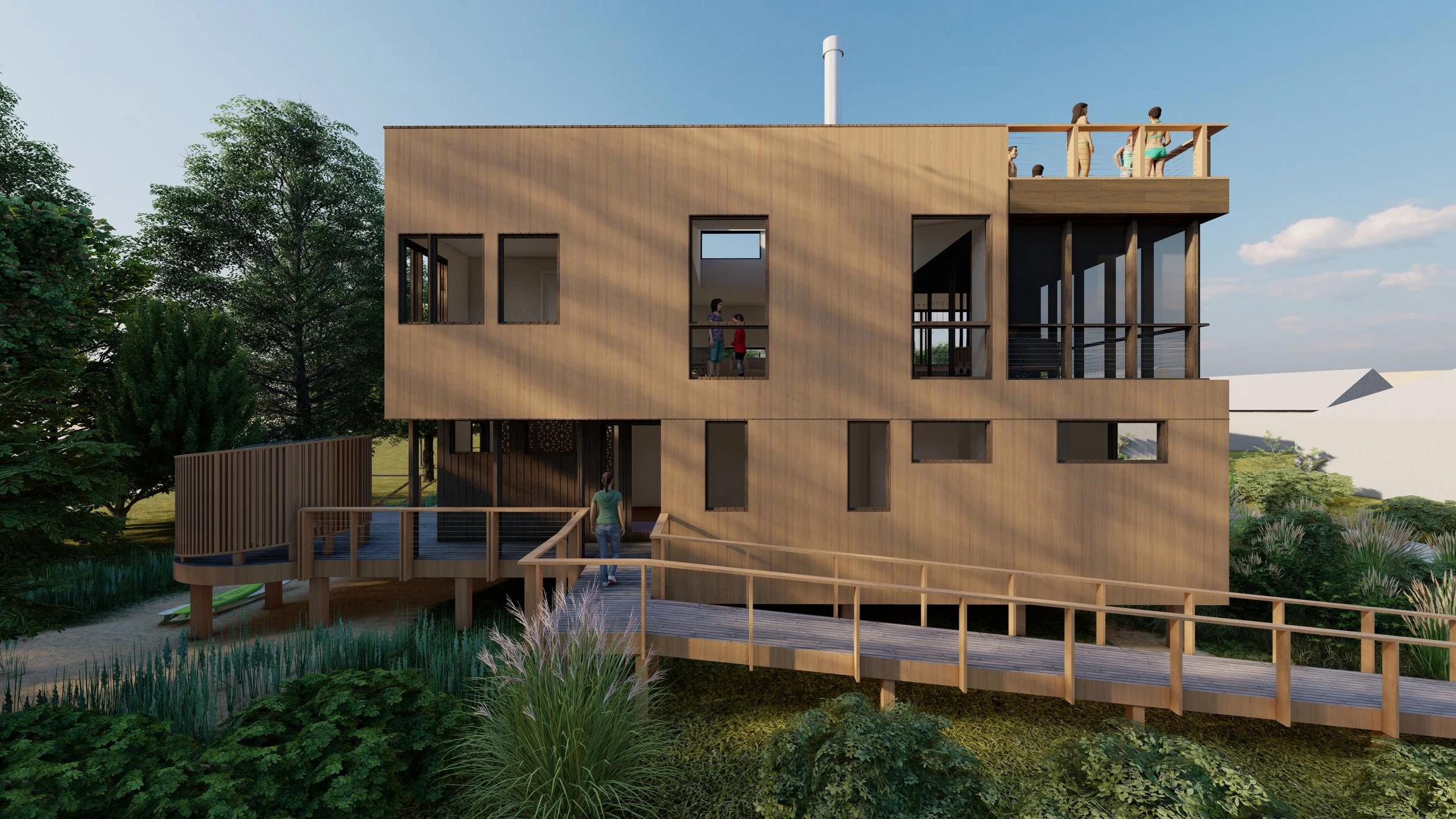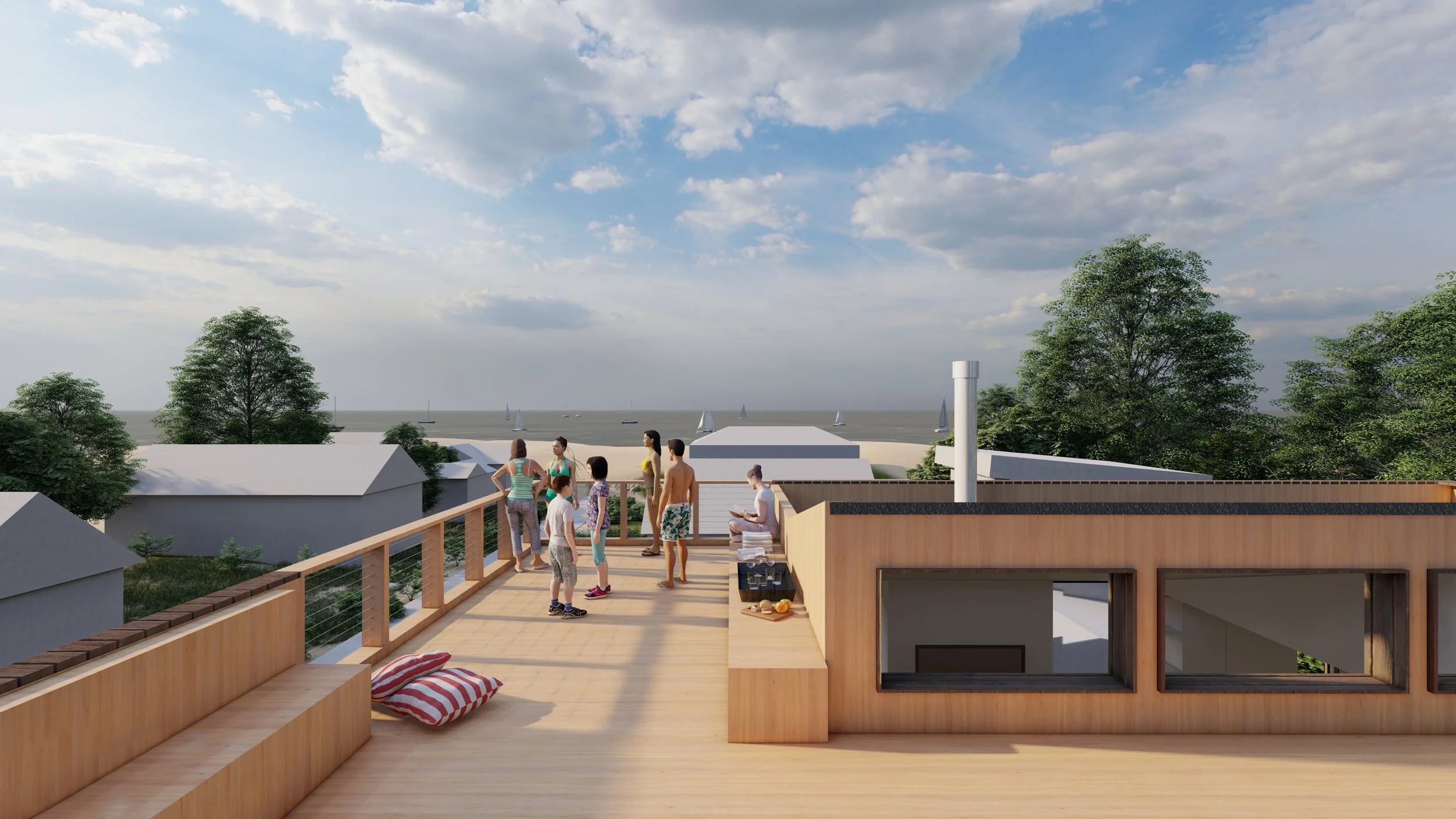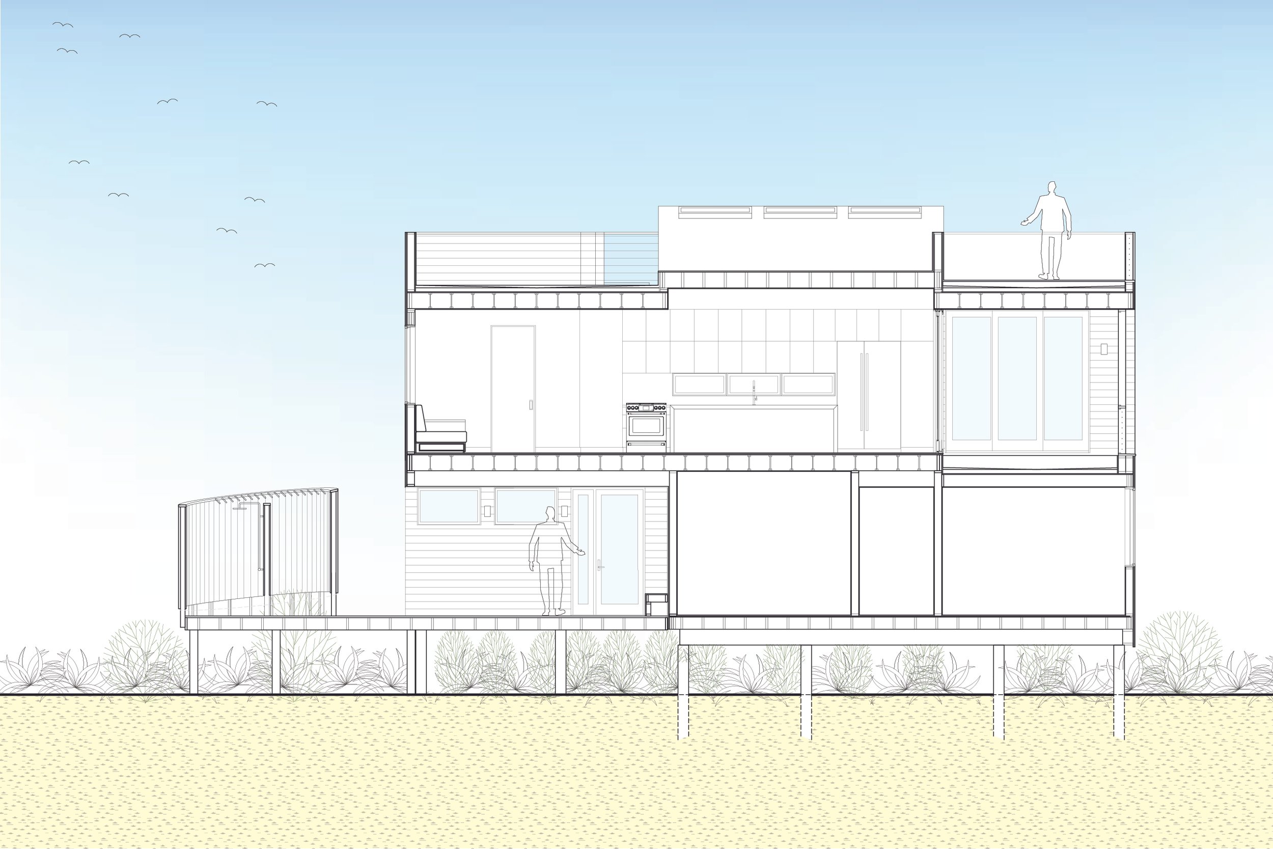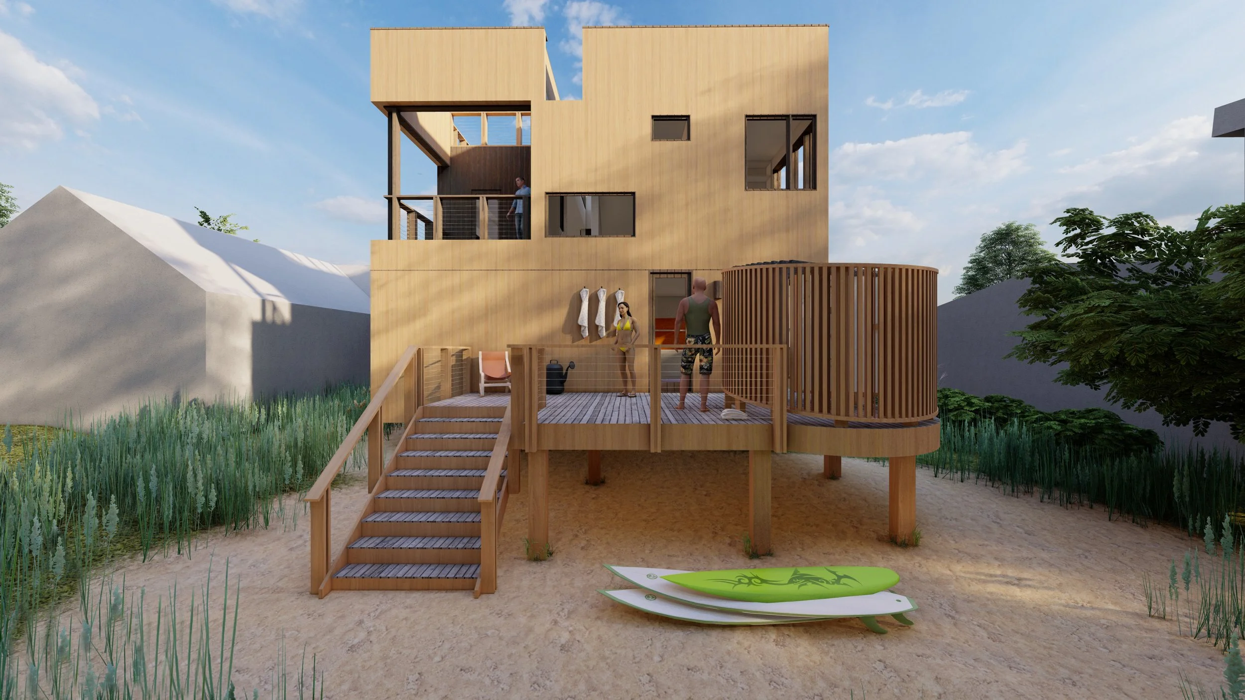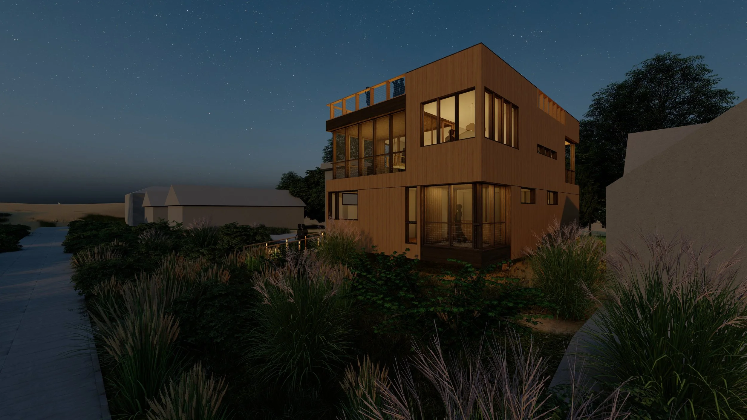 This wood-wrapped beach box is sited on a compact lot, designed to maximize ocean views and encourage a harmonious connection with Fire Island. The house blends clean lines, warm wood textures, and expansive glass, creating an inviting and serene living environment. The carefully designed home incorporates a solid-void massing strategy where each corner of the house hosts an in-between, or inside/outside, program space. These areas are designed as serene retreats to relax, entertain, and soak in the beach atmosphere. Clad in a traditional fire island cedar siding, the beach house features multiple outdoor living spaces, including open decks, screened porches, and a large rooftop deck where you are presented with an expansive ocean and bay panorama.