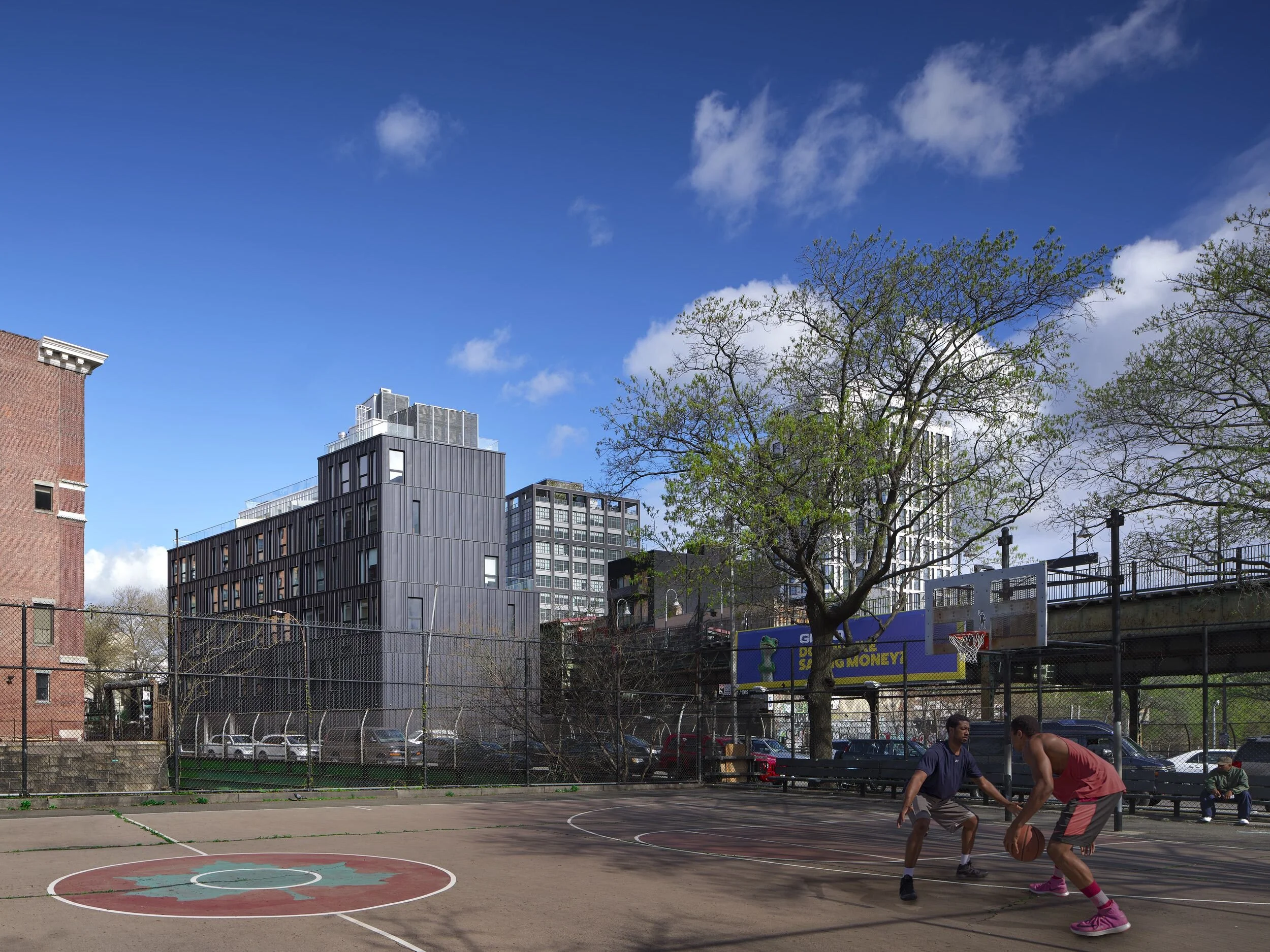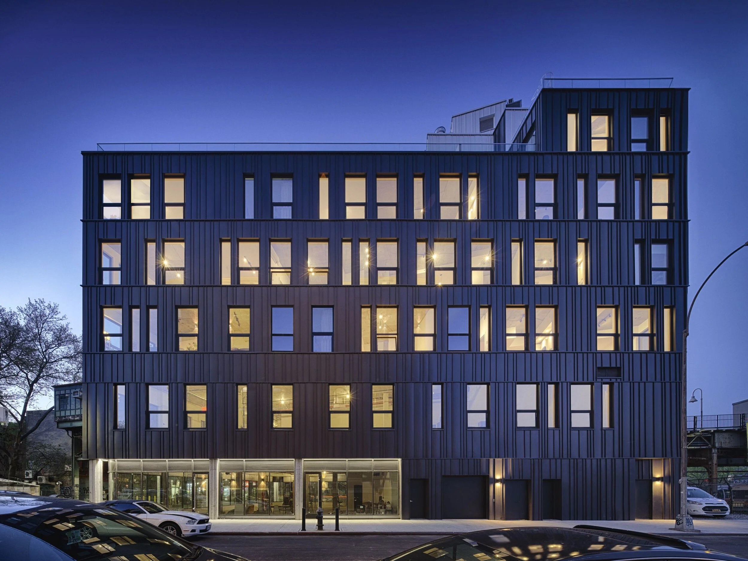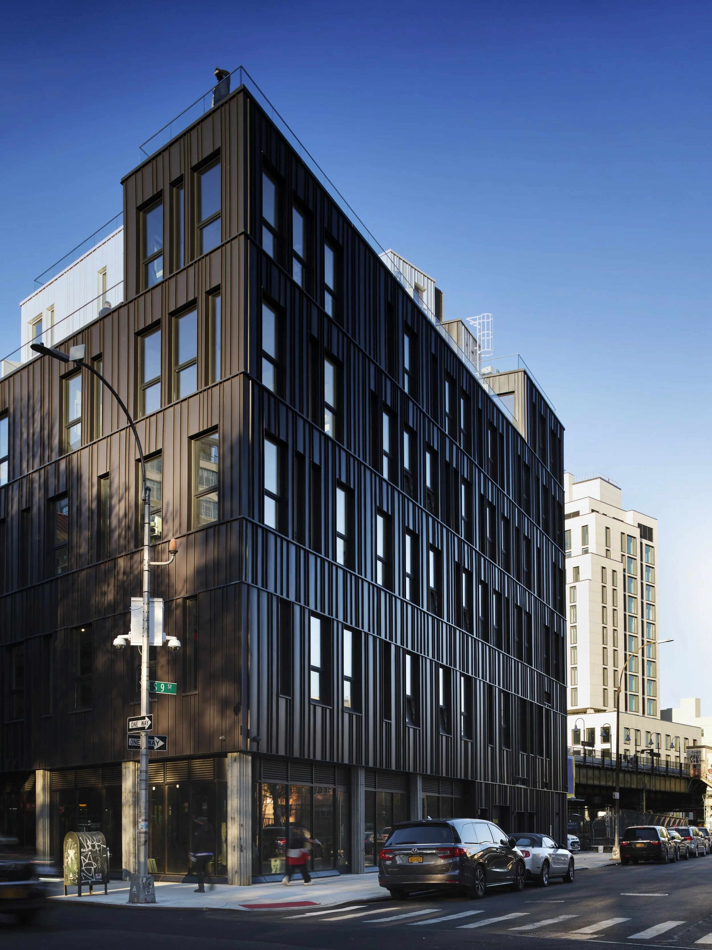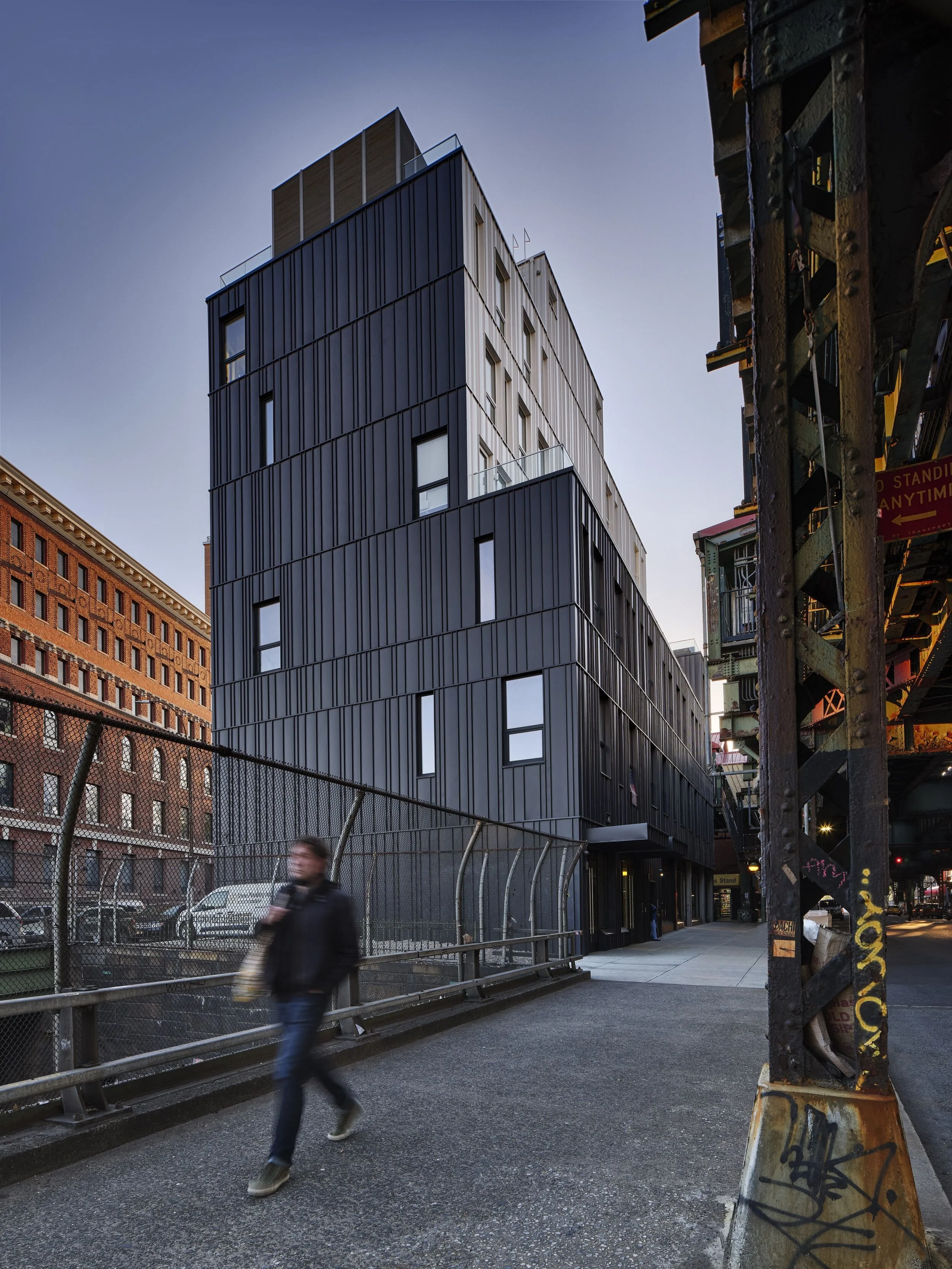 The Williamsburg Brooklyn building is a seven-story 40,000 SF ground-up, mixed-use building located in Brooklyn’s South Williamsburg neighborhood. The challenging four-sided lot is bound on the north by the elevated J, M, & Z subway train lines, to the west by the MTA station head house, and to the east, by the sunken BQE expressway. Built to replace a single-story aging 19th-century theater house, this apartment building is a single stopover on the Williamsburg bridge into downtown Manhattan. The uniquely shaped trapezoid geometry of the site contains ground-floor retail and a second-floor medical office. Both sit below 24 apartments, a mix of studios, 1 bedroom, and 2 bedroom units. The multiple zoning exposures offered an opportunity to step the building’s massing and provide outdoor space on three exposures. Terraces begin at the level of the train, and pin-wheel up and around the building, as an exterior extension of living space, promoting engagement with neighbors and the city. The black-clad metal panel base wraps up around to the terrace levels. At the setbacks, a contrasting white aluminum skin rises. The textured façade is punched by triple-glazed acoustically rated windows.
