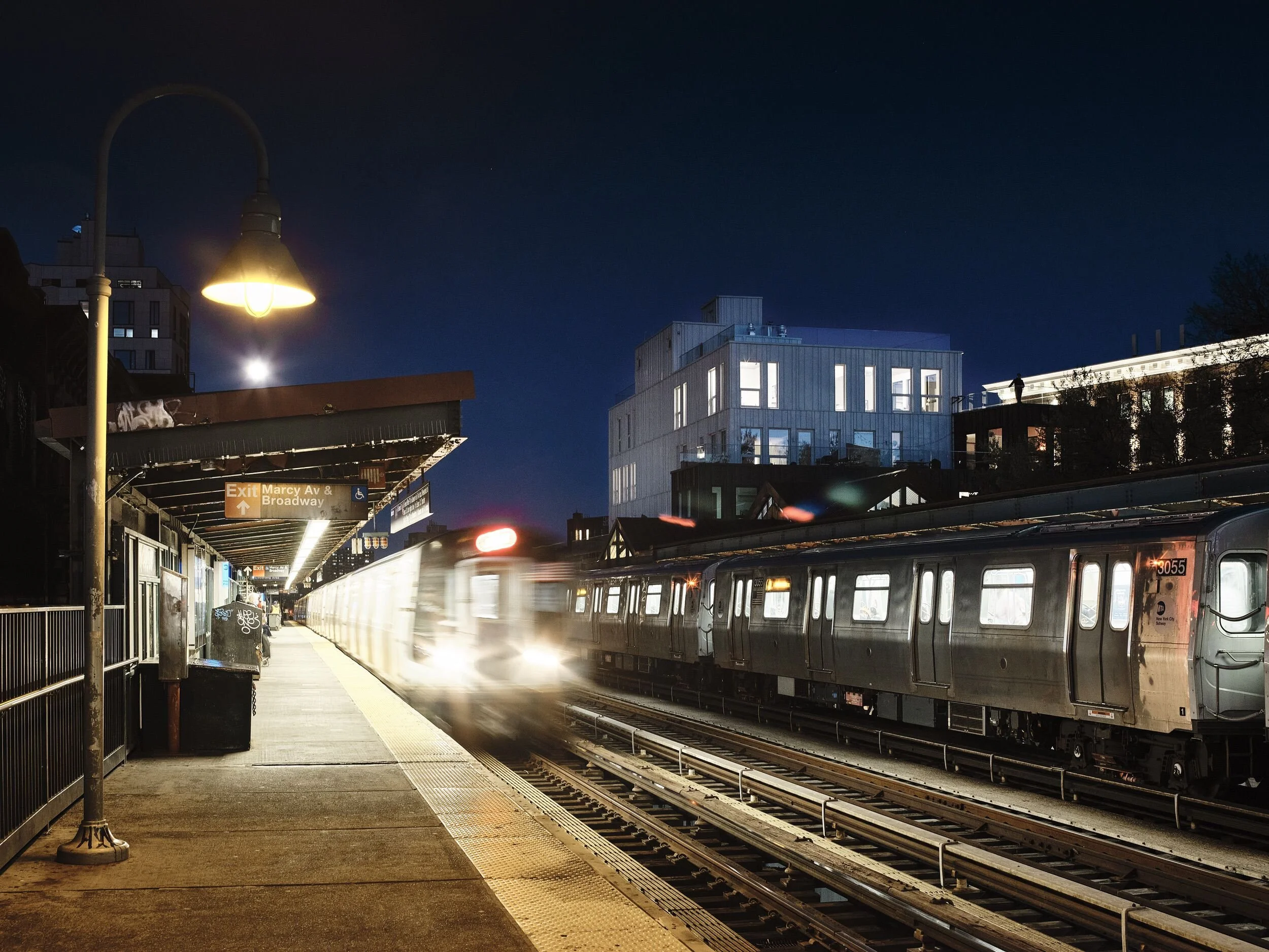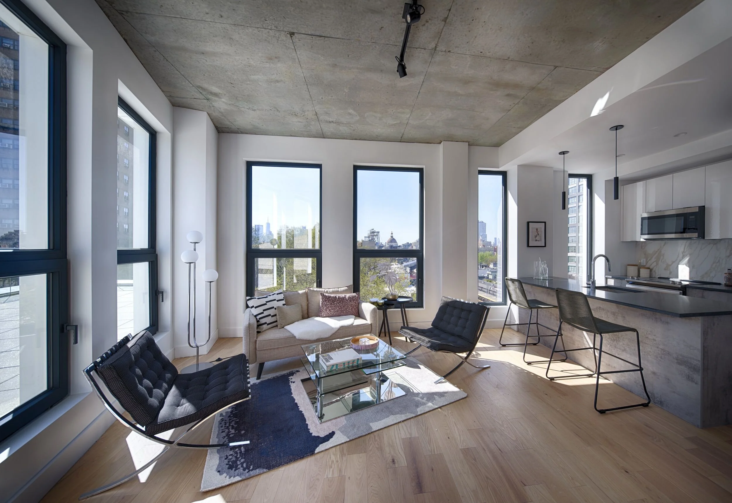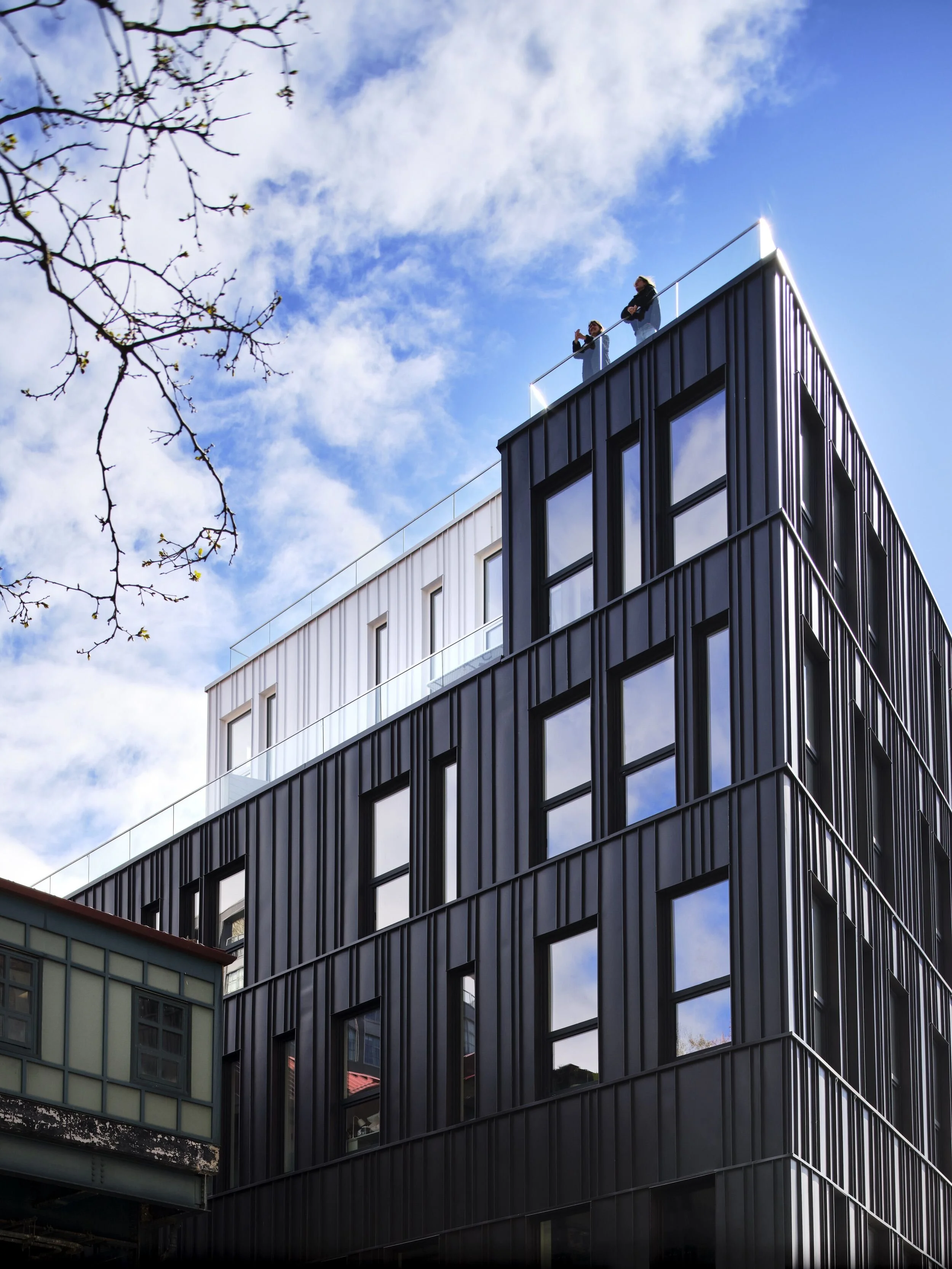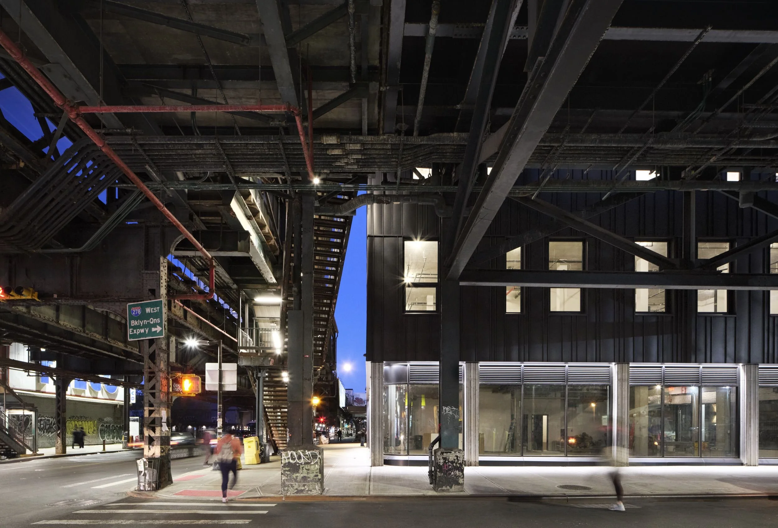 The Williamsburg Brooklyn building is a seven-story 40,000 SF ground-up, mixed-use building located in Brooklyn’s South Williamsburg neighborhood. The challenging four-sided lot is bound on the north by the elevated J, M, & Z subway train lines, to the west by the MTA station head house, and to the east, by the sunken BQE expressway. Built to replace a single-story aging 19th-century theater house, this apartment building is a single stopover on the Williamsburg bridge into downtown Manhattan. The uniquely shaped trapezoid geometry of the site contains ground-floor retail and a second-floor medical office. Both sit below 24 apartments, a mix of studios, 1 bedroom, and 2 bedroom units. The multiple zoning exposures offered an opportunity to step the building’s massing and provide outdoor space on three exposures. Terraces begin at the level of the train, and pin-wheel up and around the building, as an exterior extension of living space, promoting engagement with neighbors and the city. The black-clad metal panel base wraps up around to the terrace levels. At the setbacks, a contrasting white aluminum skin rises. The textured façade is punched by triple-glazed acoustically rated windows.